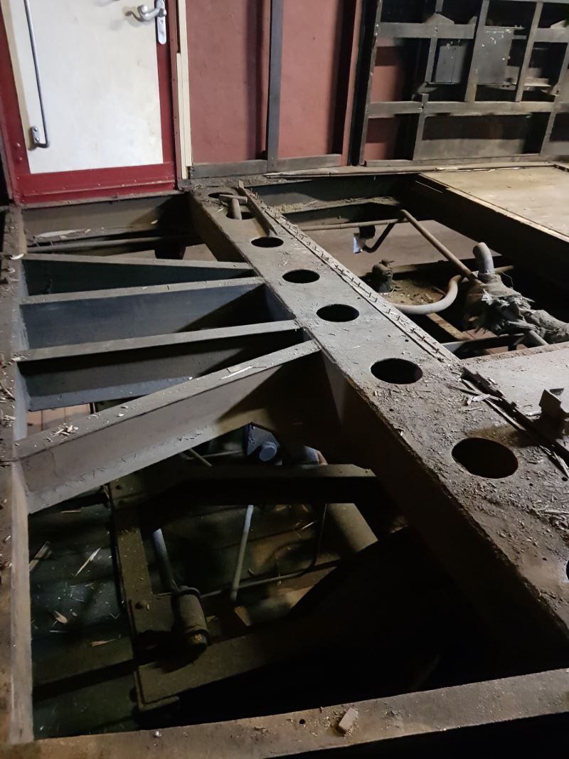 Wir haben noch Teile des Fußbodens entfernt, um die darunter liegende Rahmenkonstruktion zu begutachten. Wir waren sehr positiv überrascht. Alle tragenden Teile haben die Jahrzehnte unbeschadet überstanden. Auf dem folgenden Bild ist der gelochte Hauptträger zu sehen, über den sich der Wagenkasten auf dem darunter liegenden Drehgestell mit den Laufachsen abstützt. Strahlenförmig nach links im Bild führen die Träger, welche die Zug- und Stoßkräfte von der Fahrzeugkupplung und den Puffern aufnehmen.