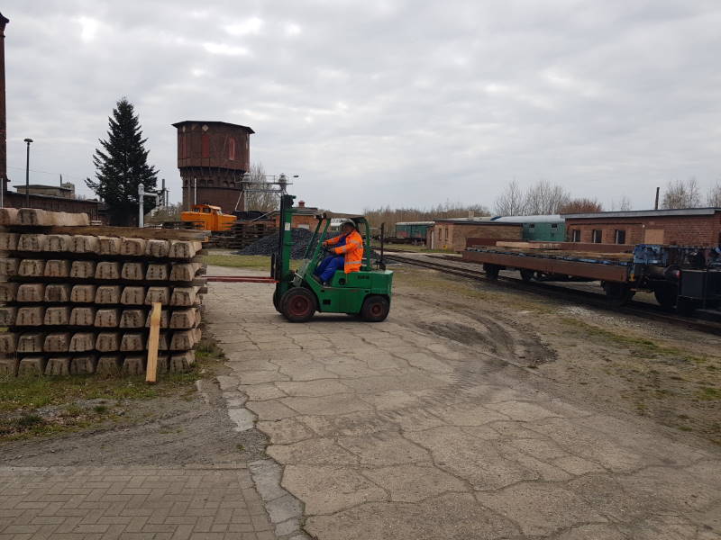 Auch außerhalb des Lokschuppens ging es weiter. So wurden die bisher vorübergehend gelagerten Schwellenstapel auf Güterwagen verladen und an ihren endgültigen Lagerplatz gebracht.