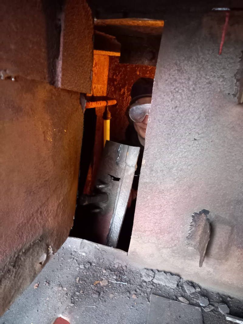 Auch am Tender für die Dampflok 50 3570 ging der unerbittliche Kampf gegen den Rost und Kalkablagerungen weiter. Heute wurde die Innenseite des Tenders von grobem Kalk befreit und die Verschlüsse der Ablaufventile gangbar gemacht. Mit ihnen kann der Wasserzulauf vom Wasserkasten des Tenders zur Lok unterbrochen werden, wenn es eine Störung an den Pumpen der Lok oder Wartungsarbeiten gibt. Die Arbeiten sind ziemlich mühsam, weil sich die Kollegen vom hintersten Ende des Tenders bis zur anderen Seite, die zur Lok zeigt, vorarbeiten müssen. Dabei mussten sie sich durch einige Aussparungen in den sogenannten Schwallblechen zwängen. Die Schwallbleche verhindern, dass das Wasser während der Fahrt ungebremst durch Tender schwappt. Die Arbeiten sind sehr unangenehm, da der Platz sehr begrenzt ist, es dunkel ist und die Geräusche stark hallen. Keine Arbeit für Menschen mit Platzangst.