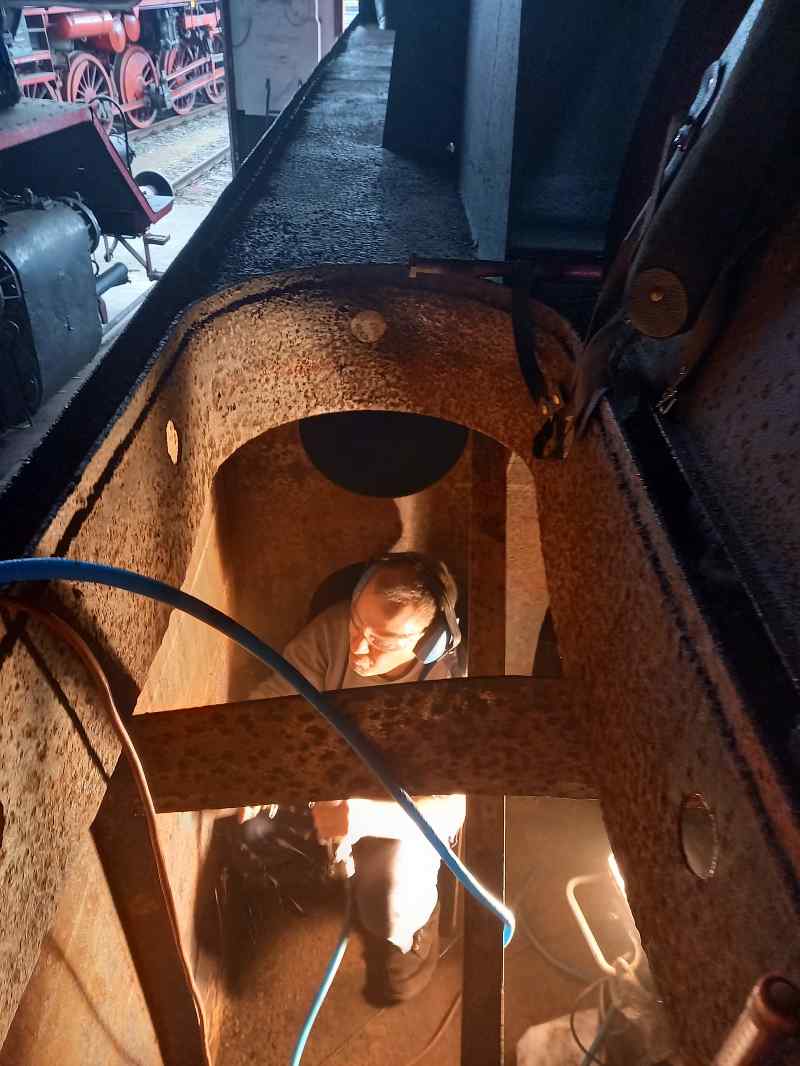 Außerdem wurden im Wasserkasten des Tenders einige Rost- und Kalkablagerungen entfernt. Das geschah mit einem Druckluftnadler, was einen Höllenlärm erzeugt. Da ist es auf jeden Fall ratsam, wenn man bei der Arbeit Gehörschutz trägt.
