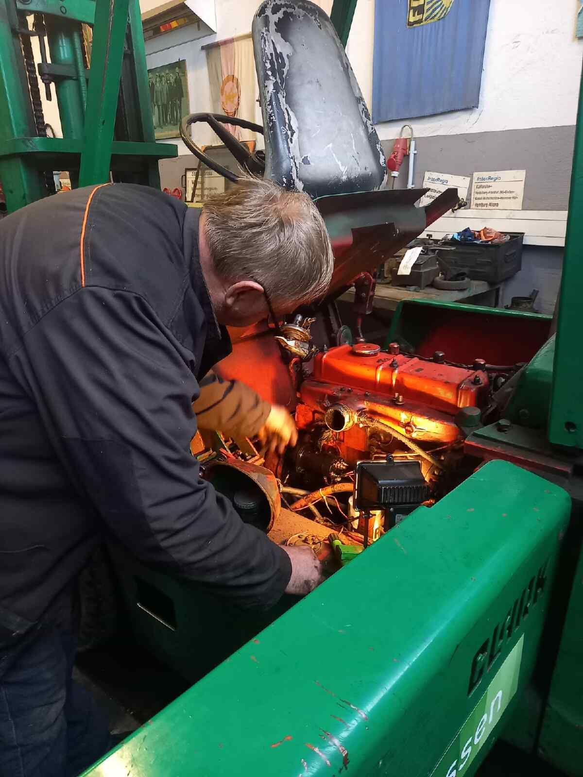 … verlagerten sich die Aktivitäten dann doch zunächst eher in den Lokschuppen. Hier gibt es Fortschritte von unserem Bagger T174 zu berichten. Nach intensiver Aufarbeitung des Antriebs und der Nebenaggregate sowie dem Ersatz aller Hydraulikleitungen ist der Zusammenbau nun soweit fortgeschritten, dass die Betriebsflüssigkeiten gefüllt werden können. Der erste Probelauf steht unmittelbar bevor.