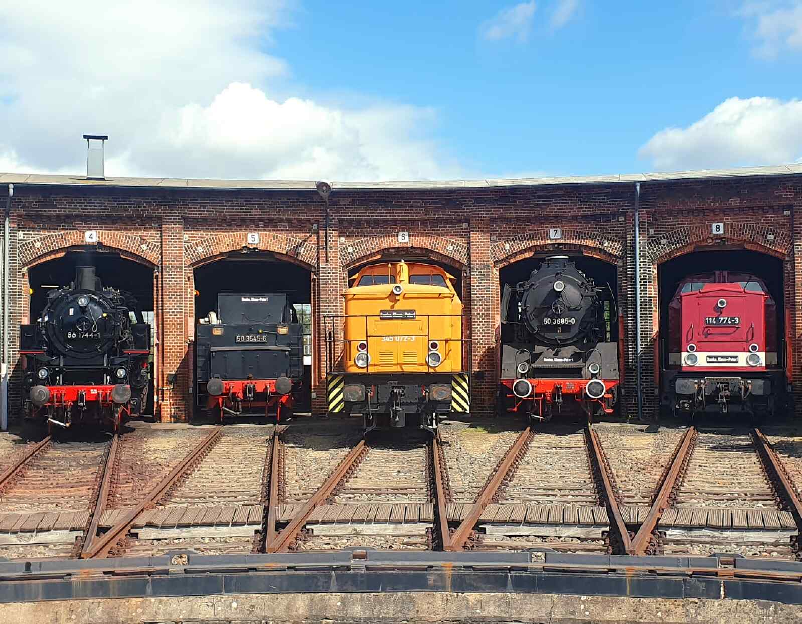 Wir hatten auch einiges zu bieten. So standen die 86 1744 der Press-Gruppe und unsere Dampflok Emma abwechselnd für Führerstandsmitfahrten zur Verfügung. Außerdem gab es wieder die beliebten Rundfahrten durchs Gelände mit unserem kleinen Museumszug, der von der Drehscheibe bis zur südlichen Grundstücksgrenze verkehrte, dort die Fahrtrichtung wechselt und zum Hauptbahnhof fuhr. Von dort aus nahm der die Gleisverbindung am Lokschuppen der Eisenbahngesellschaft Potsdam vorbei zurück zur Drehscheibe.